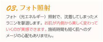 シミ・そばかすのメラニンをピンポイントで攻撃するレーザー治療とは違い、肌そのものの細胞に働きかけて活性化し、肌本来持っているみずみずしさを自然と引き出します。